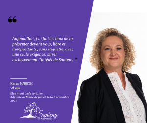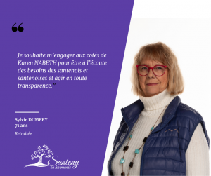 Sylvie DUMERY, 70 ans. résidente à Santeny depuis 30 ans, , originaire du Val d’Oise, retraitée, j’étais secrétaire de direction dans le privé. Je souhaite m’engager au côté de Karen pour être à l’écoute des besoins des santenois en toute transparence. Trésorière bénévole dans une association Santenoise je suis convaincue que le lien social se créé autour du sport, de la culture et des loisirs. Je vous fais confiance pour soutenir Karen Nabeth dans ses idées pour l’avenir de Santeny.