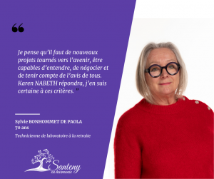 Sylvie BONHOMMET DE PAOLA. Technicienne de laboratoire à la retraitée. 70 ans, Santenoise depuis 37 ans, 35 ans dans le quartier des Graviers et depuis 18 mois dans le Domaine. J’étais technicienne de laboratoire pendant 30 ans, j’ai pratiqué quasiment dans toutes les disciplines de laboratoire. Puis j’ai décidé de changer de métier, j’ai passé le concours de l’école des cadres de l’APHP à 50 ans, je suis devenue cadre, j’ai terminé ma carrière à l’hôpital Henri Mondor dans le service d’anatomo, pathologie. Je suis très intéressée par les travaux manuels, bricolage, travaux d’aiguilles et de couture, je suis responsable de l’activité « couture, tricot, broderie » de l’ACS depuis 2018. J’ai l’esprit de famille, je suis de nature optimiste, très organisée, j’adore aller au cinéma. Je souhaite intégrer l’équipe de Karen Nabeth, car je pense qu’il faut de nouveaux projets tournés vers l’avenir, être capable d’entendre, de négocier et de tenir compte de l’avis de tous, prendre des décisions pour les familles, la santé, le centre-ville, les commerces, la circulation, la qualité de vie à Santeny….