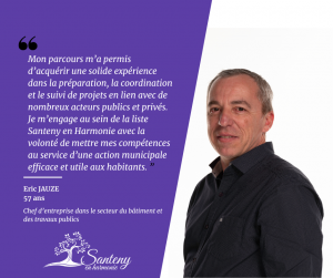 Éric JAUZE – 57 ans, chef d’entreprise dans le secteur du bâtiment et des travaux publics. J’habite chemin des Vignes à Santeny depuis 2007. Je suis chef d’entreprise dans le secteur du bâtiment et des travaux publics, et économiste de la construction depuis plus de 25 ans. Mon parcours m’a permis d’acquérir une solide expérience dans la préparation, la coordination et le suivi de projets, en lien avec de nombreux acteurs publics et privés. Je suis attaché à la rigueur, au respect des engagements et au travail collectif. Sensibilisé aux enjeux du cadre de vie, des équipements et de la bonne gestion des projets communaux, je m’engage au sein de la liste Santeny en Harmonie avec la volonté de mettre mes compétences au service d’une action municipale efficace, structurée et utile aux habitants.