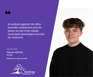 Valentin MOTUEL – 23 ANS, Étudiant en cybersécurité. je termine ma 5ème année dans une école d’ingénieurs avec une spécialisation en cybersécurité. Depuis que je suis né, j’habite Santeny dans le Domaine et je souhaite apporter des idées nouvelles notamment pour les jeunes au sein d’une équipe municipale dynamique et proche des Santenois.