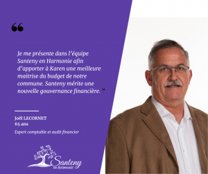 Joël LECORNET – Expert comptable – audit financier J’ai 65 ans, j’ai 3 enfants et je suis maintenant retraité. J’habite Santeny depuis 25 ans dans le quartier du Pré Brûlé. J’ai fait ma carrière dans le monde de la finance : expertise comptable, Commissariat aux comptes, audit et direction financière. Après les 6 années de l’équipe sortante où le niveau d’endettement par habitant a explosé et l’utilité de certains travaux est questionnable. Je me présente dans l’équipe Santeny en Harmonie, afin d’apporter à Karen une meilleure maitrise du budget de notre commune. Mon objectif sera de redonner un équilibre entre dépenses, investissements et fonctionnement. Notre ville mérite une nouvelle gouvernance financière