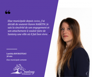 Laetitia BOURGITEAU. 38 ans, Élue municipale sortante. quartier du centre village, 38 ans, spécialiste des risques et vulnérabilités sociales et environnementales, je suis une citoyenne engagée dans plusieurs associations tournées vers la préservation de l’Environnement et la défense des droits des usagers. Élue municipale depuis 2020, j’ai décidé de soutenir Karen Nabeth car j’ai eu la chance de travailler à ses côtés durant 6 années et de voir la sincérité de son engagement et son attachement à vouloir faire de Santeny une ville où il fait bon vivre. Nous partageons la vision d’un Santeny authentique, attractif et préservé.