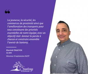 Pierrick THAUVIN, 53 ans, j’habite dans le quartier des Graviers à SANTENY depuis 2018. Suite aux conseils d’un ami, nous avons découvert cette commune et, avec mon épouse, nous sommes rapidement tombés sous le charme de ce village et de son cadre de vie. Après 29 ans passés dans un groupe de transport, où j’ai gravi progressivement les échelons, je suis devenu directeur d’exploitation. Cette expérience m’a permis de développer un solide sens des responsabilités, de l’organisation et du service public, ainsi qu’une réelle capacité d’écoute et de gestions des équipes. J’ai choisi d’intégrer l’équipe de Karen NABETH, car je suis convaincu qu’elle peut apporter un nouveau souffle, du dynamisme et une réelle volonté de donner un nouvel élan à notre charmant village. La jeunesse, la sécurité, les commerces de proximité ainsi que l’amélioration des transports pour tous constituent des priorités essentielles de notre équipe, avec un objectif clair donner la parole à chacun et construire ensemble l’avenir de SANTENY. Animé par l’envie de m’engager pour notre commune et à l’écoute de chacun, je souhaite contribuer, avec vous, à faire vivre pleinement notre projet commun : Santeny en harmonie.