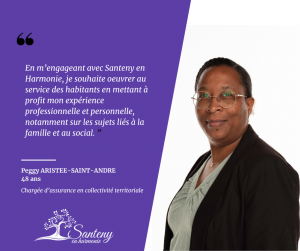 Peggy Aristée-Saint-André – 48 ans, Route Nationale 19.Chargée d’assurance en collectivité territoriale. Arrivée à Santeny en 2024, je suis immédiatement tombée sous le charme de ce village. Chargée d’assurances au sein d’une collectivité territoriale du Val-de-Marne, j’ai également exercé des missions en ressources humaines et en comptabilité publique. Maman de deux enfants scolarisés au collège Georges Brassens, je suis particulièrement attentive aux enjeux liés à la famille, à l’éducation et au social. J’ai rejoint l’équipe de Karen Nabeth pour leur qualité d’écoute et leur engagement auprès de tous les Santenois, qu’ils soient de longue date ou nouvellement arrivés. En m’engageant avec Santeny en Harmonie, je souhaite œuvrer au service des habitants en mettant à profit mon expérience professionnelle et personnelle, notamment sur les sujets liés à la famille et au social.