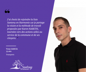 TONY GARCIA – 33 ans, Intervenant assistance transport. Habitant du centre village de Santeny depuis plusieurs années, âgé de 33 ans, je suis sensible aux questions concrètes qui concernent le quotidien des habitants. Mon métier dans le domaine du transport me permet d’exercer une activité de terrain, au contact direct des réalités du quotidien. Souhaitant m’investir dans une démarche locale, honnête et constructive, j’ai choisi de rejoindre cette liste car je partage la vision et la méthode de travail proposées par Karen, tournées vers des actions utiles au service de la commune.