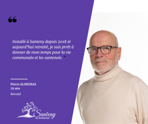 PIERRE ALMERAS – 79 ans habitant au Domaine depuis 2018. Après plus de 60 ans passés à Gennevilliers dans les Hauts-de-Seine, j’ai choisi de m’installer à Santeny pour la qualité de vie et la tranquillité qu’offre notre commune. Ce changement a été un vrai choix de cœur et tous les jours je me dis que nous avons de la chance de vivre ici ! Artisan sellier automobile de formation, j’ai dirigé mon entreprise jusqu’à ma retraite en 2011. Mon parcours m’a appris le sens du travail bien fait, la rigueur et l’importance de la relation humaine. Aujourd’hui, je suis vice-président de la plus grande association santenoise, à laquelle je suis profondément attaché. Je m’investis pour préserver et développer les activités qui contribuent au bien-être des habitants et au dynamisme de notre ville. Avec l’équipe Santeny En Harmonie, je souhaite continuer à donner de mon temps et de mon énergie pour une commune conviviale, active et sereine.