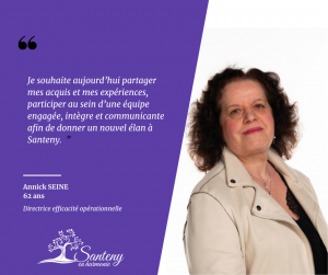 Annick SEINE – 62 ans – Directrice Efficacité Opérationnelle. Résidente au Domaine de Santeny depuis 2003. En couple, mère d’un enfant, je vis à Santeny depuis plus de vingt ans. J’y ai construit ma vie personnelle et je suis profondément attachée à notre commune. J’ai exercé l’ensemble de ma carrière comme Directrice des Ressources Humaines au sein de grands groupes français et américains. Cette expérience m’a permis de piloter des équipes, conduire des transformations, gérer des situations complexes et traiter des enjeux sociaux et juridiques exigeants. Aujourd’hui en préretraite, j’exerce des fonctions de Directrice Efficacité Opérationnelle, une fonction qui m’amène toujours à traiter de questions d’ordre social et juridique.. Je souhaite aujourd’hui partager mes acquis et mes expériences, participer au sein d’une équipe engagée, intègre et communicante afin de donner un nouvel élan à Santeny.