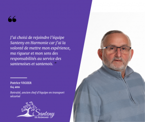 Patrice VIGIER – 64 ANS. Santenois depuis 45 ans, j’habite le quartier des Pendants. Je suis profondément attaché à ma commune, dont j’ai suivi l’évolution au fil des décennies. Santeny est le village où j’ai construit ma vie. Durant ma carrière dans le transport sécurisé, j’ai exercé les fonctions de chef d’équipe. Un poste exigeant, fondé sur la rigueur, le sens des responsabilités et la confiance. Encadrer des équipes et assurer des missions sensibles m’ont permis de développer un esprit d’organisation, du sang-froid et une vraie fiabilité. Reconnu pour ma simplicité et mon sens du contact, j’apprécie les moments de convivialité qui font vivre l’esprit de village. Amateur de pétanque, je participe volontiers à ces instants de partage entre habitants. Très attaché à mes chats, je suis également sensible à la qualité de vie et à l’équilibre qui font de Santeny un cadre de vie apprécié. Aujourd’hui, je rejoins Santeny en Harmonie avec la volonté de mettre mon expérience, ma connaissance de la commune et mon sens des responsabilités au service des Santenoises et des Santenois, et de contribuer concrètement à l’avenir de notre village.