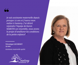 VERONIQUE LECORNET RAUX – 59 ans. Assistante maternelle agréée. Je suis assistante maternelle depuis presque 22 ans et j’exerce mon métier à Santeny (au Pré Brûlé) où j’habite depuis 2005.